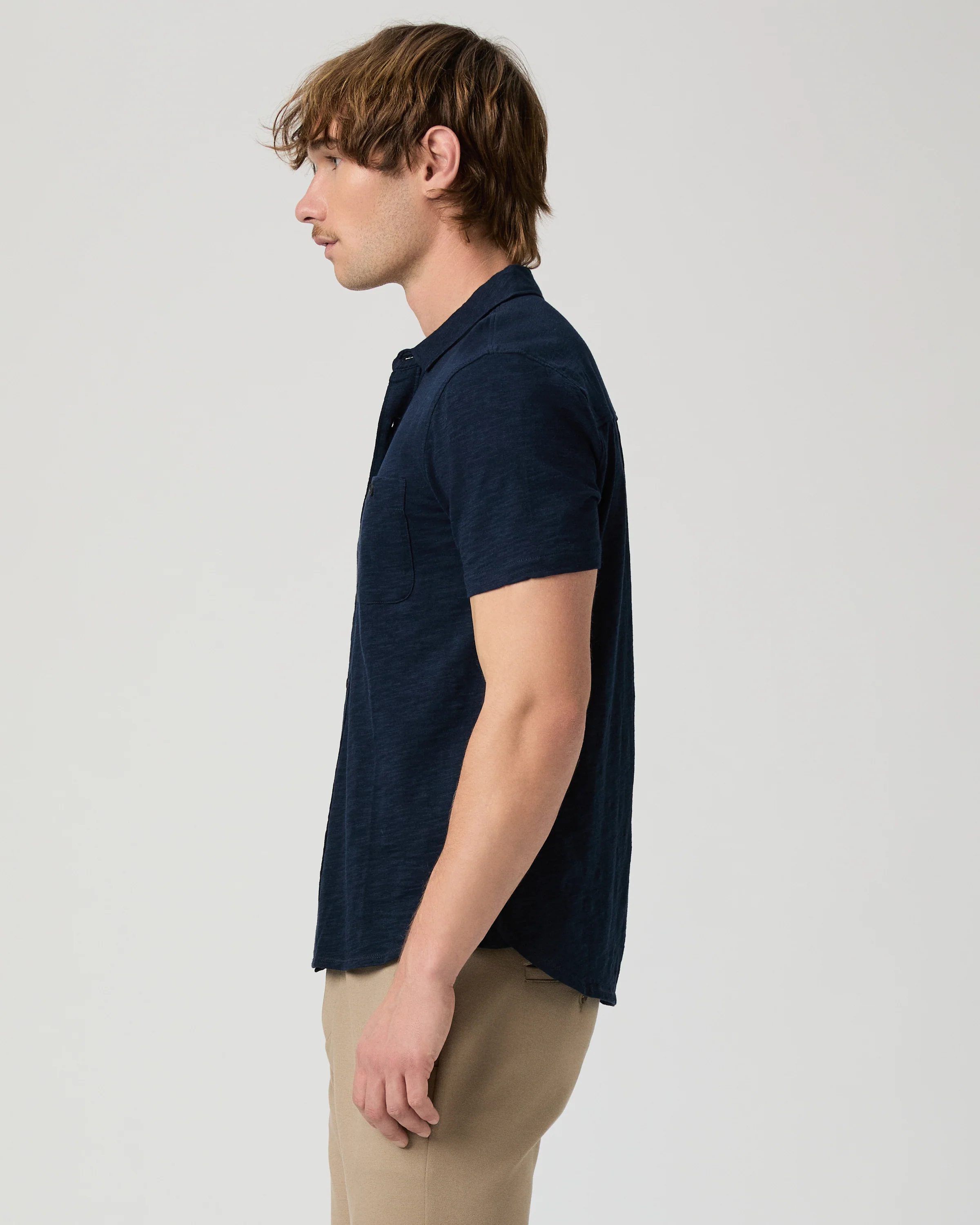 Carillo is our short sleeve button-down with a single chest pocket that’s finished with a button detail. Crafted from our supremely soft cotton slub jersey material in classic navy blue, this versatile piece can be dressed up, dressed down or layered over a tee.