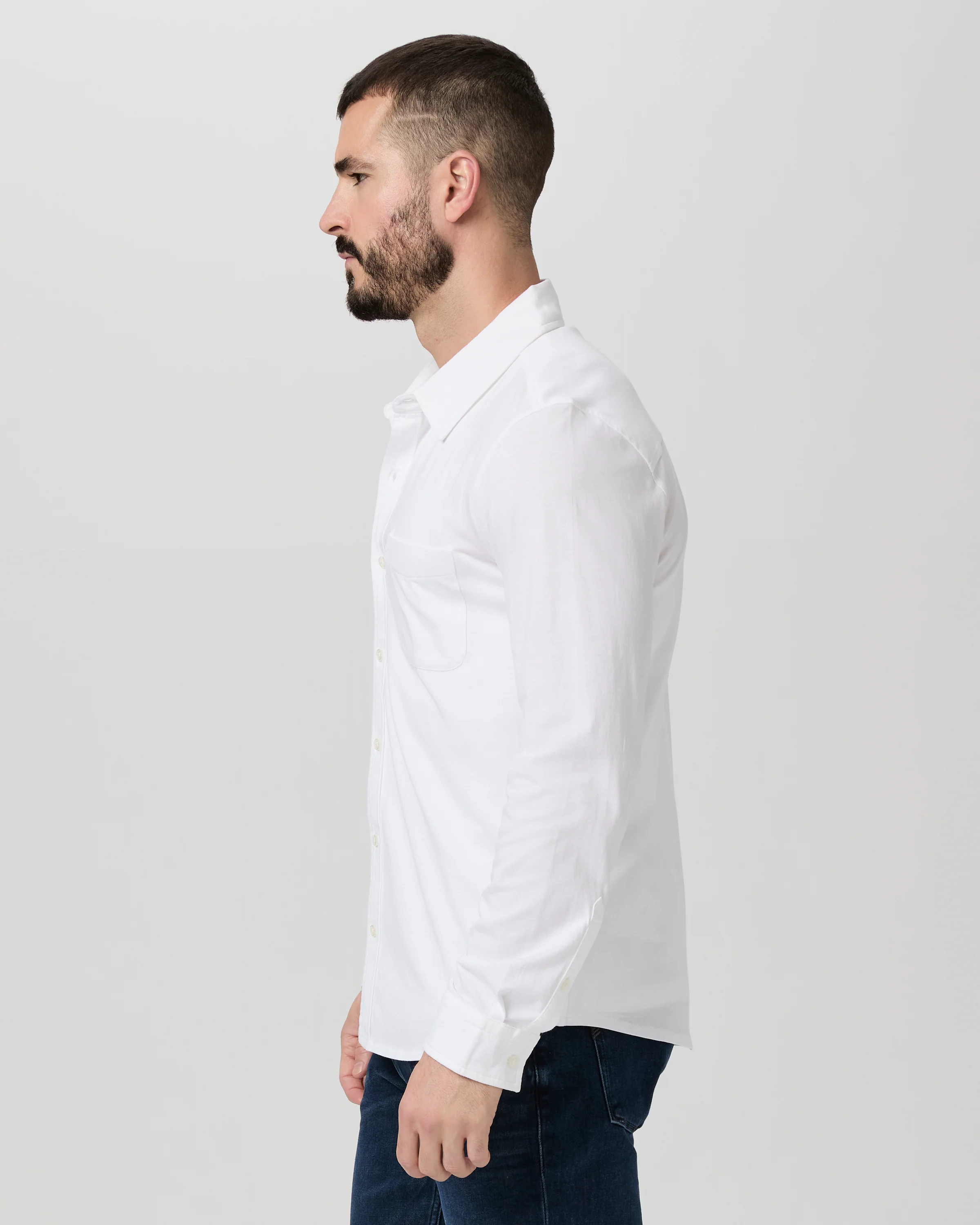 The Cosgrove Long Sleeve Button Up Shirt in White is made from our Pima cotton jersey material. Known for its natural luster, soft hand, and cool touch, our Pima cotton guarantees superior comfort and quality while retaining color vibrancy and shape with every wear. Harvested exclusively from certified Pima cotton farms in the USA, each piece reflects our dedication to exceptional craftsmanship.
