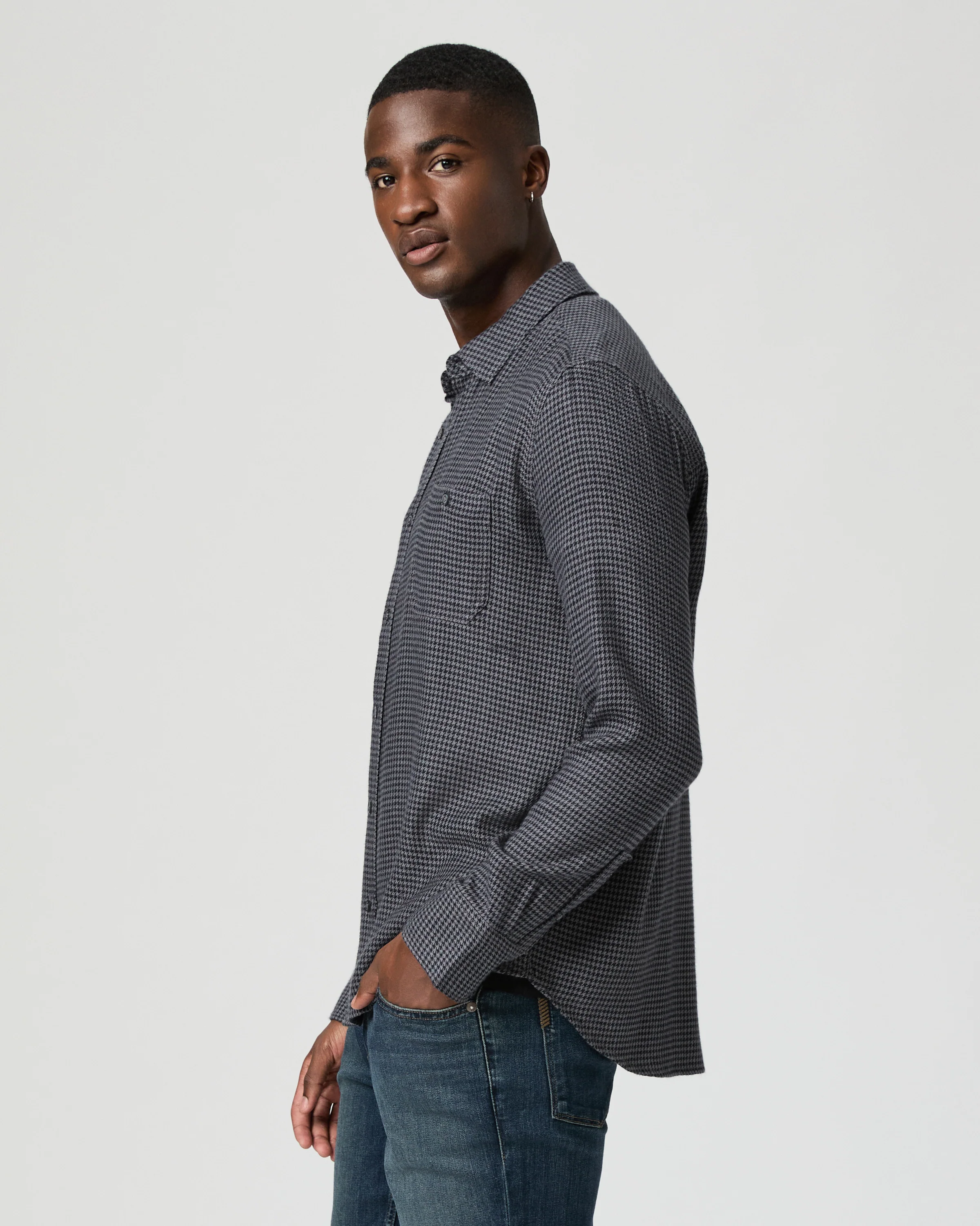 Our favorite flannel is back in a custom dark navy and ash blue micro houndstooth print with double chest pockets and rubberized buttons. This lightweight, brushed cotton blend button down will be the softest shirt in your closet and pairs well with any shade of denim.