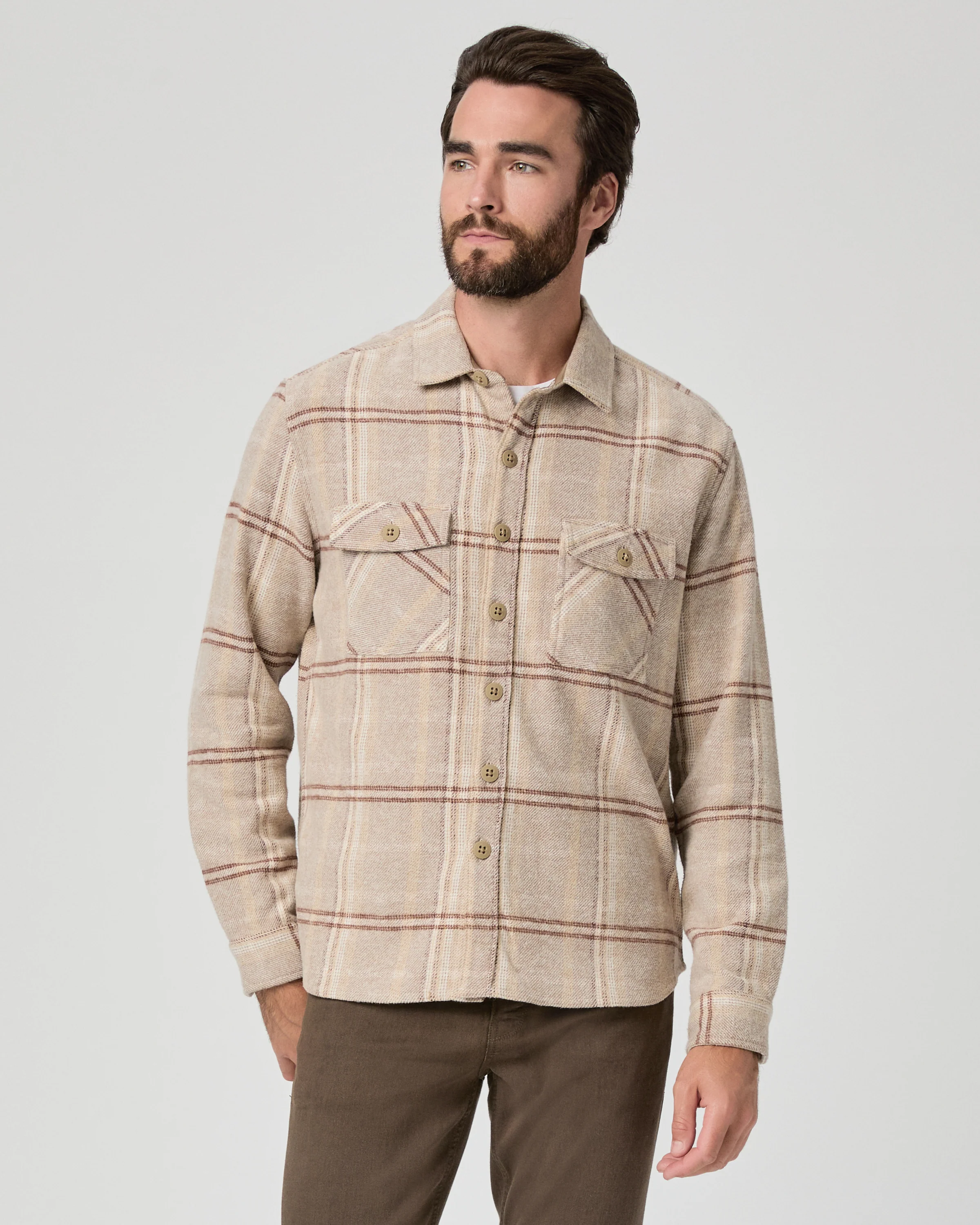 Meet your new favorite overshirt. This long-sleeved button-down comes in a light brown brushed plaid with double chest pockets and is crafted from 100% sustainably and ethically sourced cotton. This supremely soft shirt looks just as good buttoned up as it does worn unbuttoned and layered over a t-shirt.
