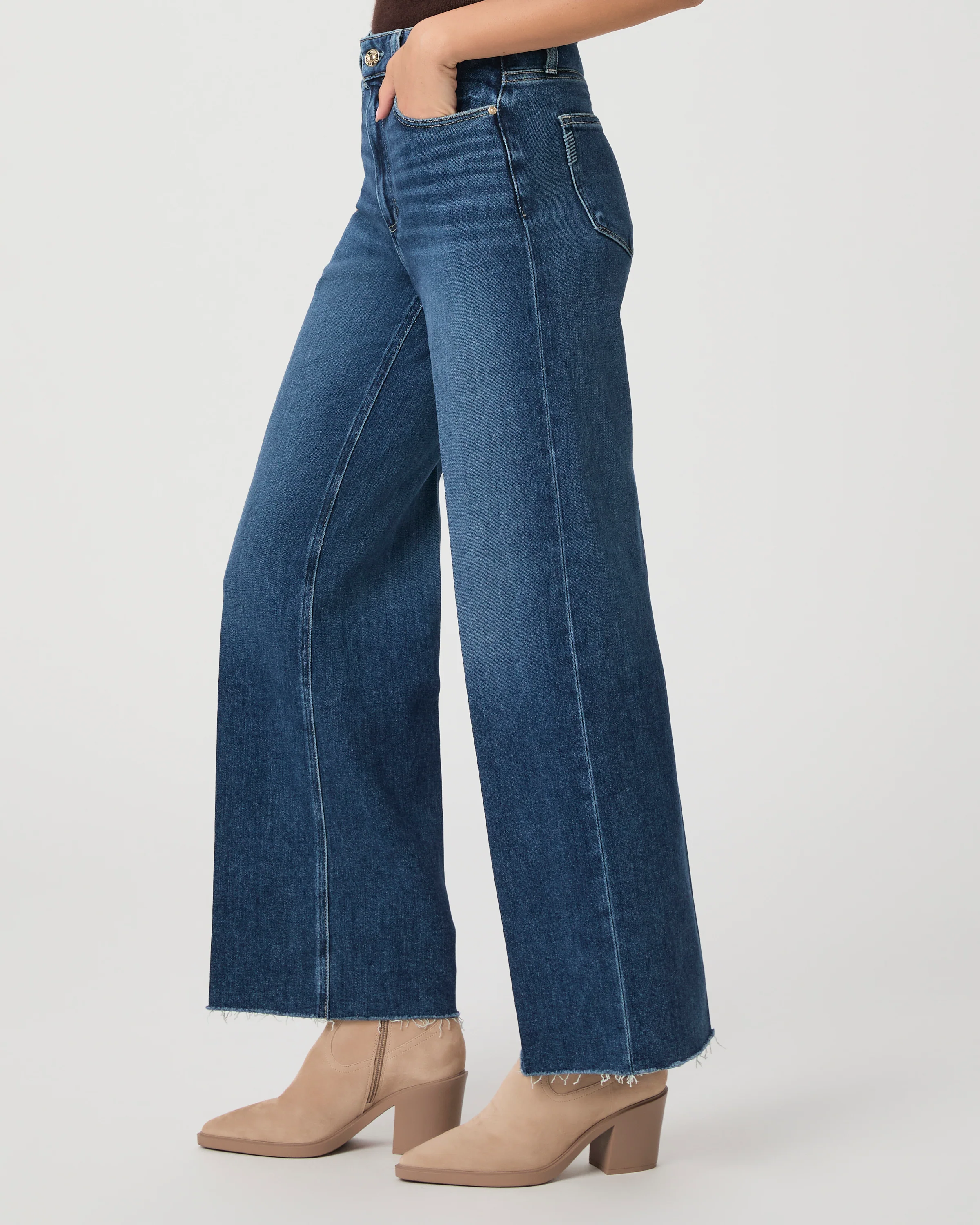 This modern high-rise wide leg has a slightly relaxed fit and a 31” inseam. Cut from our TRANSCEND VINTAGE denim in an aged dark wash with natural fading, German gold hardware, and a raw hem, this style has the look of authentic vintage denim but is incredibly comfortable with plenty of stretch and recovery.