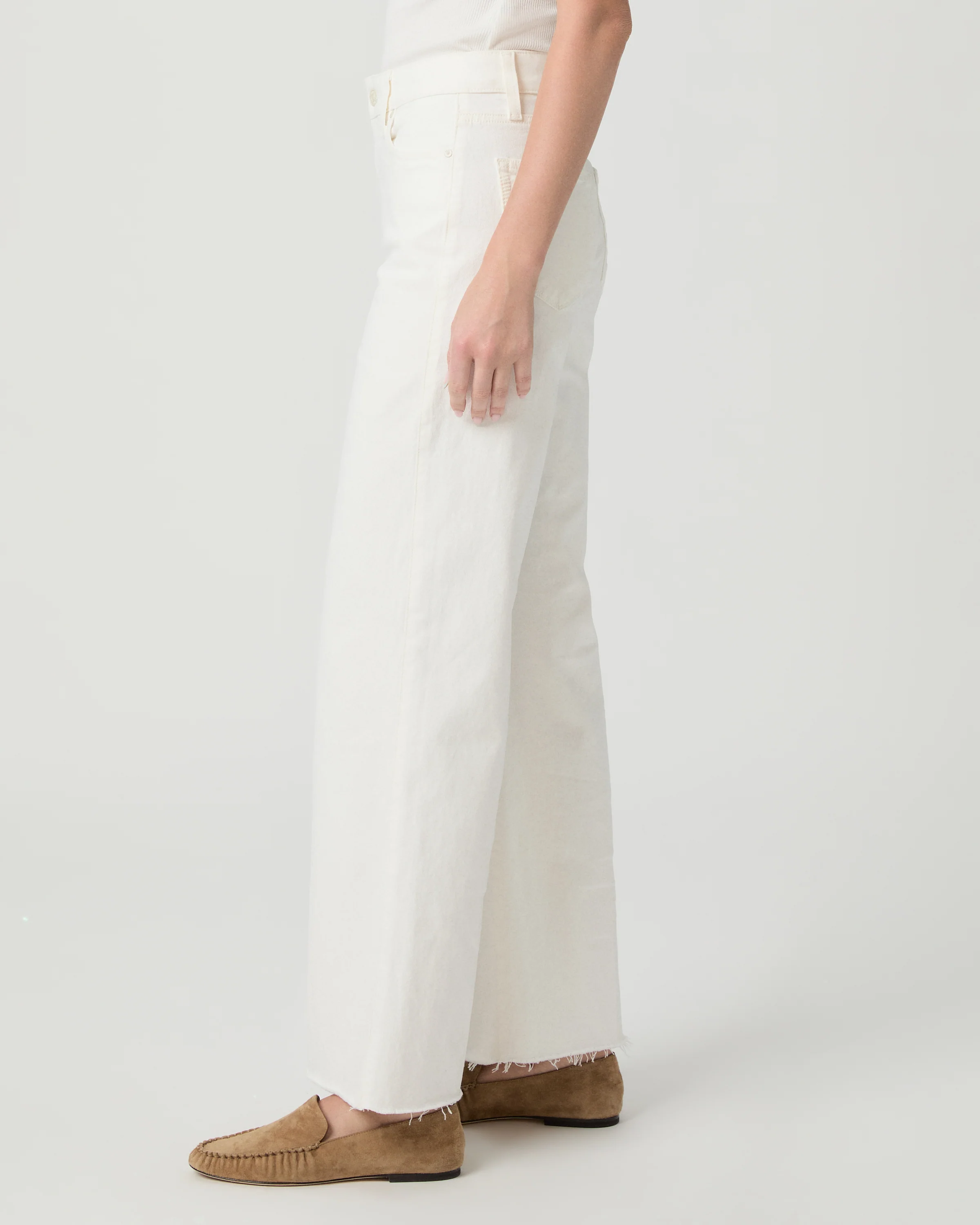 This high-rise wide leg has a slightly relaxed fit and a 31” inseam. Crafted in comfort stretch tonal ecru denim with matching tonal ecru hardware and a raw hem, this pair has plenty of coverage and the perfect amount of stretch.