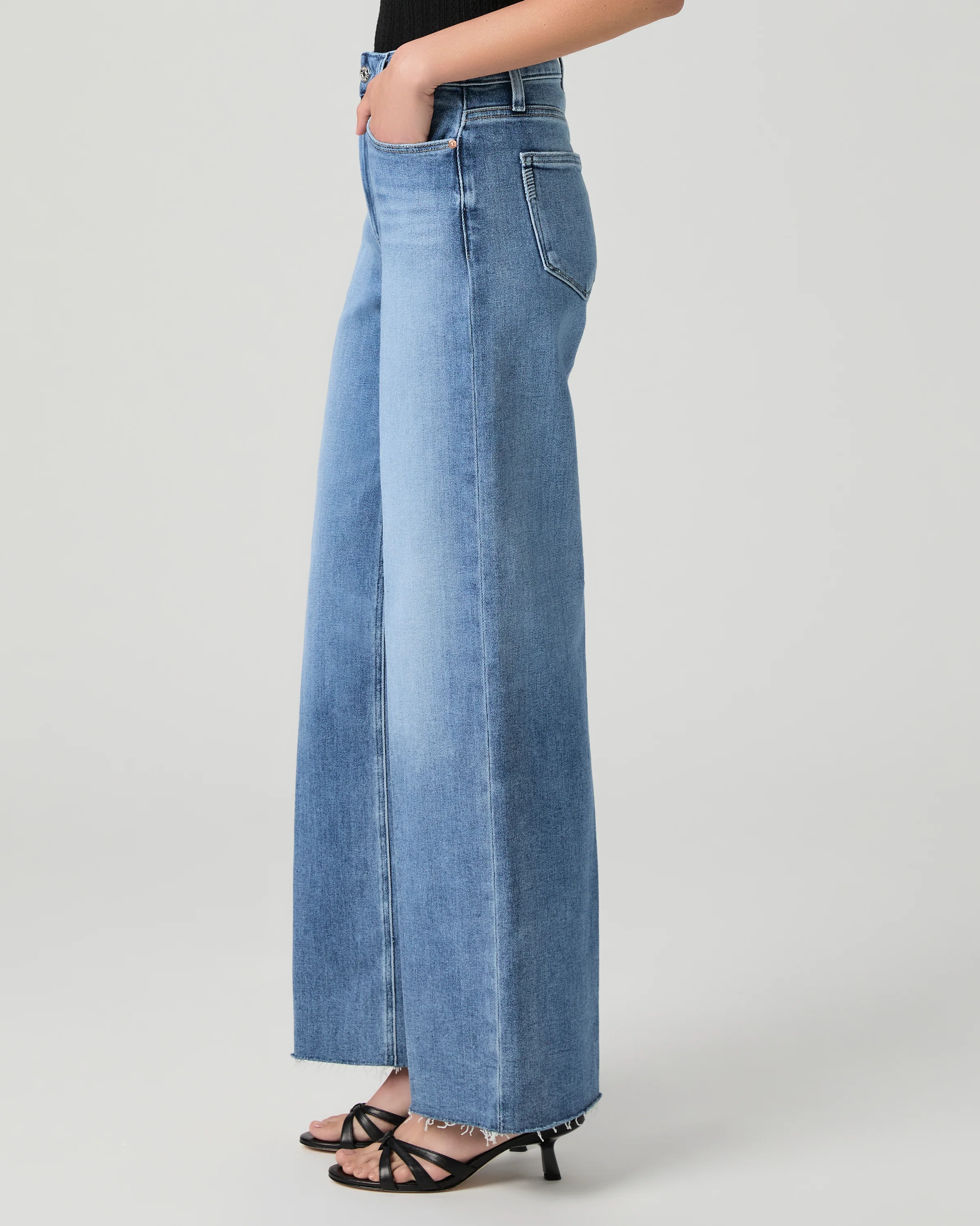 This modern high-rise wide leg has a slightly relaxed fit and a 31" inseam. This pair is crafted in PAIGE VINTAGE denim in a vintage-inspired medium wash with natural fading and a raw hem. PAIGE VINTAGE takes all of the work out of breaking in your favorite pair of vintage jeans. We've combined the comfort of stretch with everything you love about authentic vintage denim to create super soft jeans that feel perfectly lived-in from the very first wear.