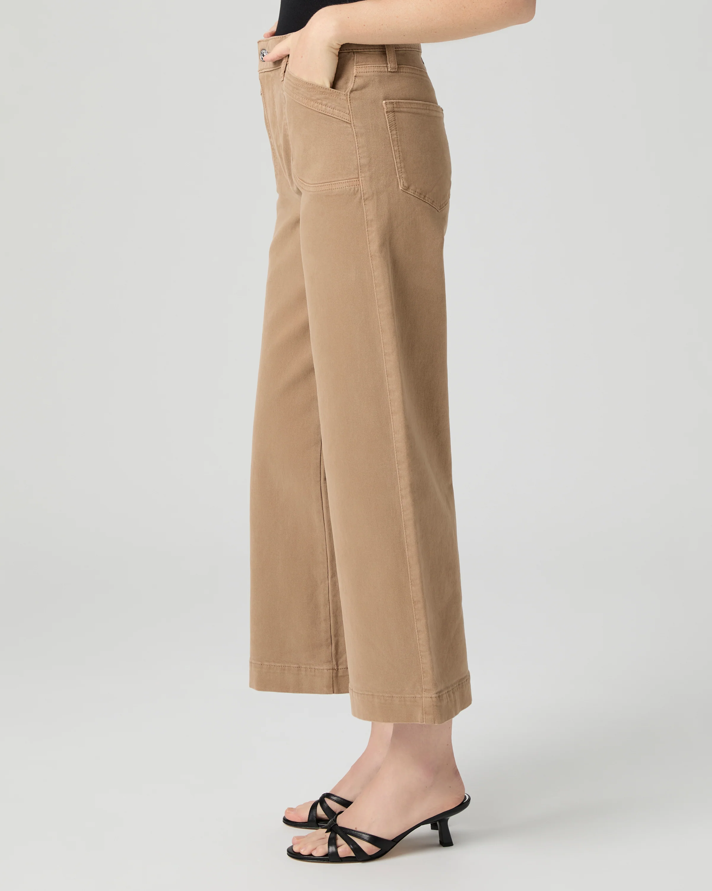 This modern high-waisted wide leg has an easy, relaxed fit with an ankle length inseam. This pair comes in a vintage-inspired khaki hue with curved inset pockets and is crafted from comfort stretch denim with plenty of coverage and the perfect amount of stretch.