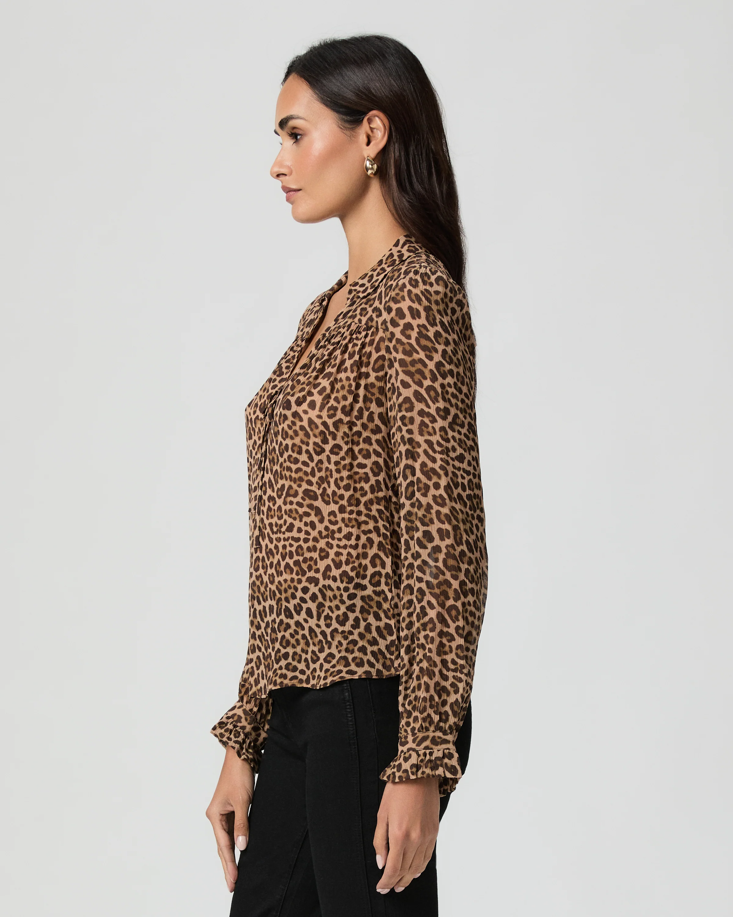 Crafted from 100% georgette silk with a crinkle texture in a natural leopard print, this long sleeve v-neck blouse features a collared design with a keyhole and tie detail at the center front. Ruffle cuffs, a wide front yoke, and shirring add a refined, feminine touch, making the Artois Blouse a luxurious addition to any wardrobe.