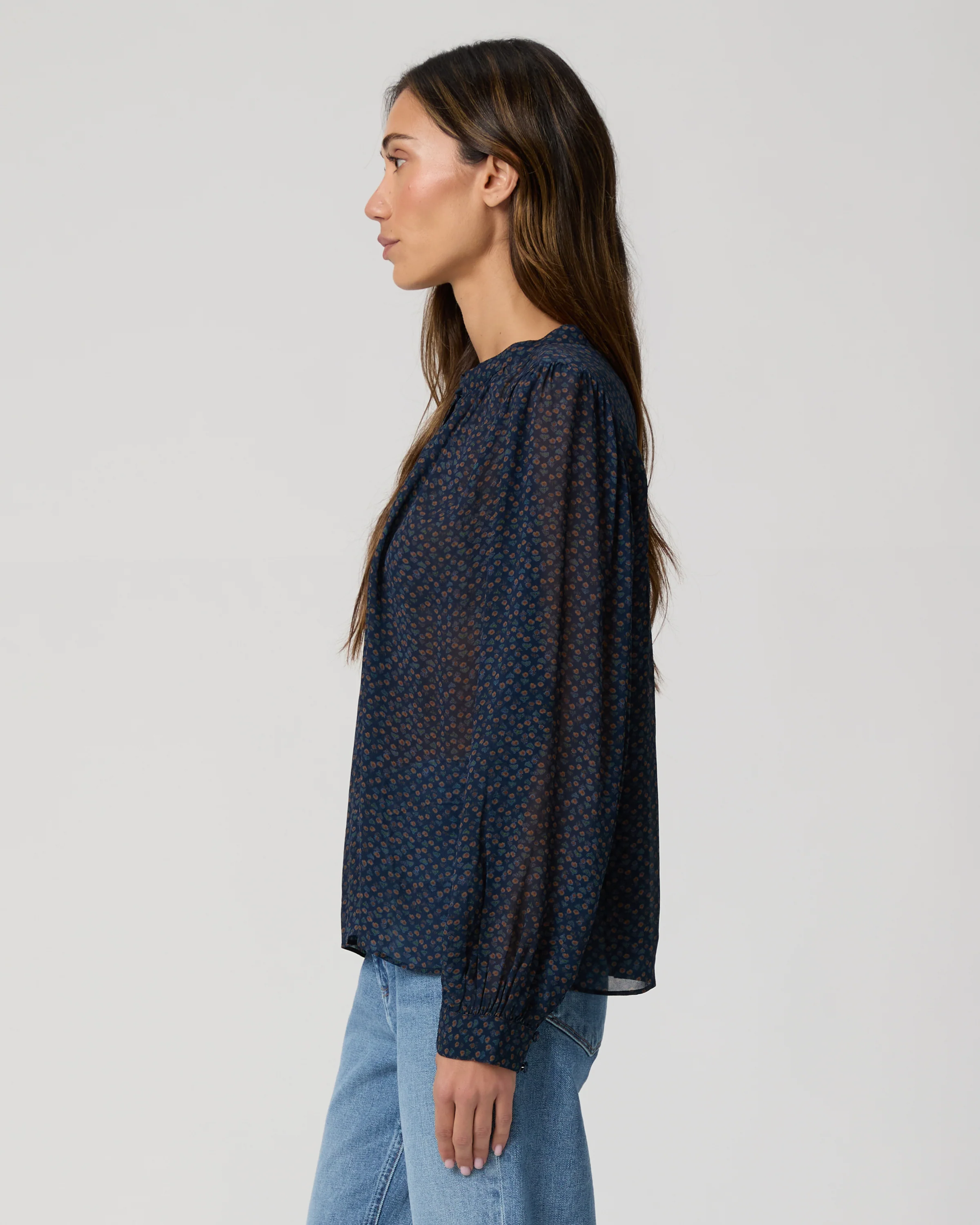 Crafted from our new 100% viscose georgette in a navy blue ditsy floral print, this long sleeve blouse is designed with a crew neckline with a center front keyhole and shirring details. Pair the Bibiana Blouse with any shade of denim.