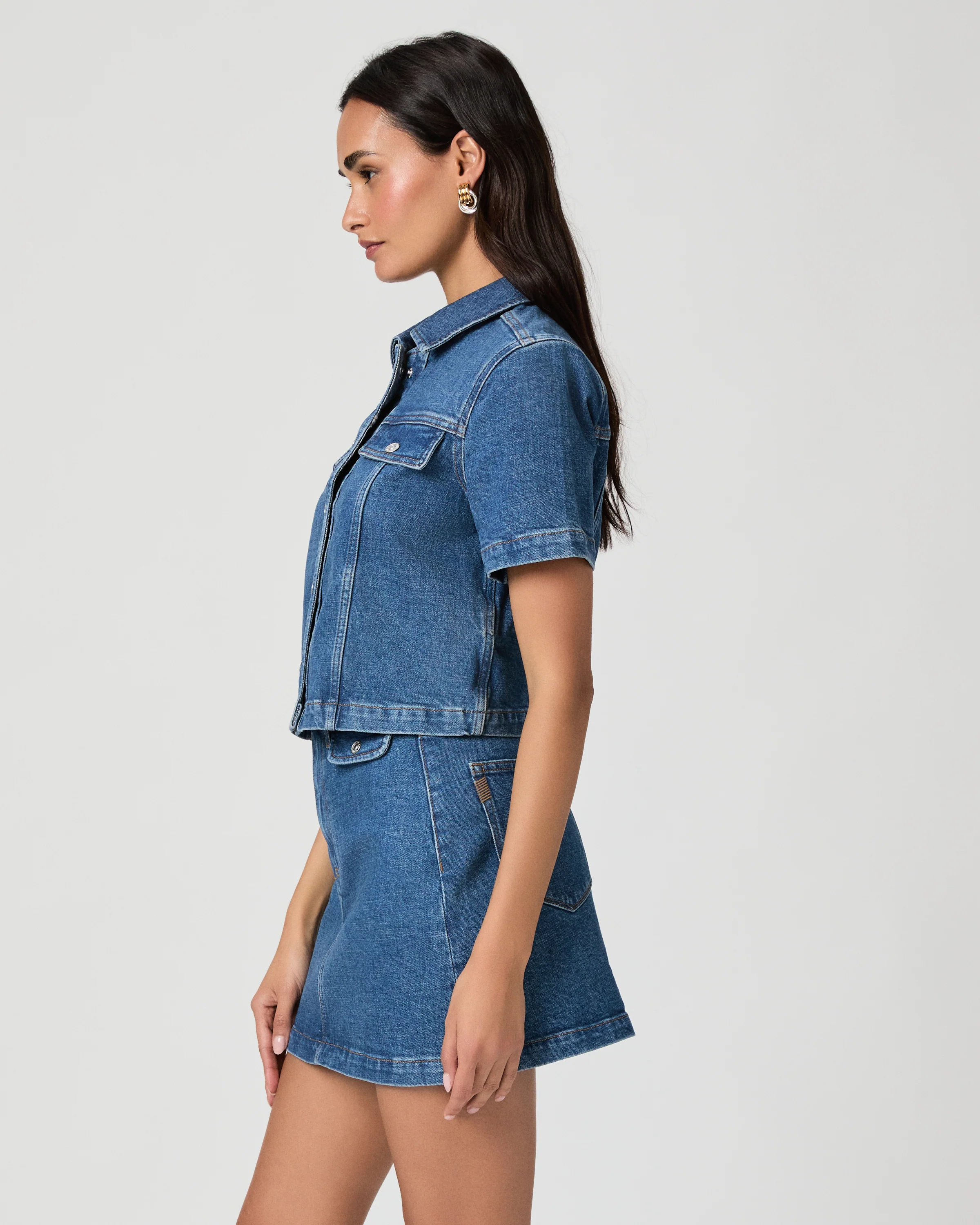 A fresh take on the classic denim jacket, designed in a medium blue wash with a slightly cropped fit and short sleeves. Featuring silver buttons and refined seaming details, this style can be worn open as a light layer or buttoned up as a top. Pair the Elly Jacket with the matching Janelle Skirt for a modern double-denim look.
