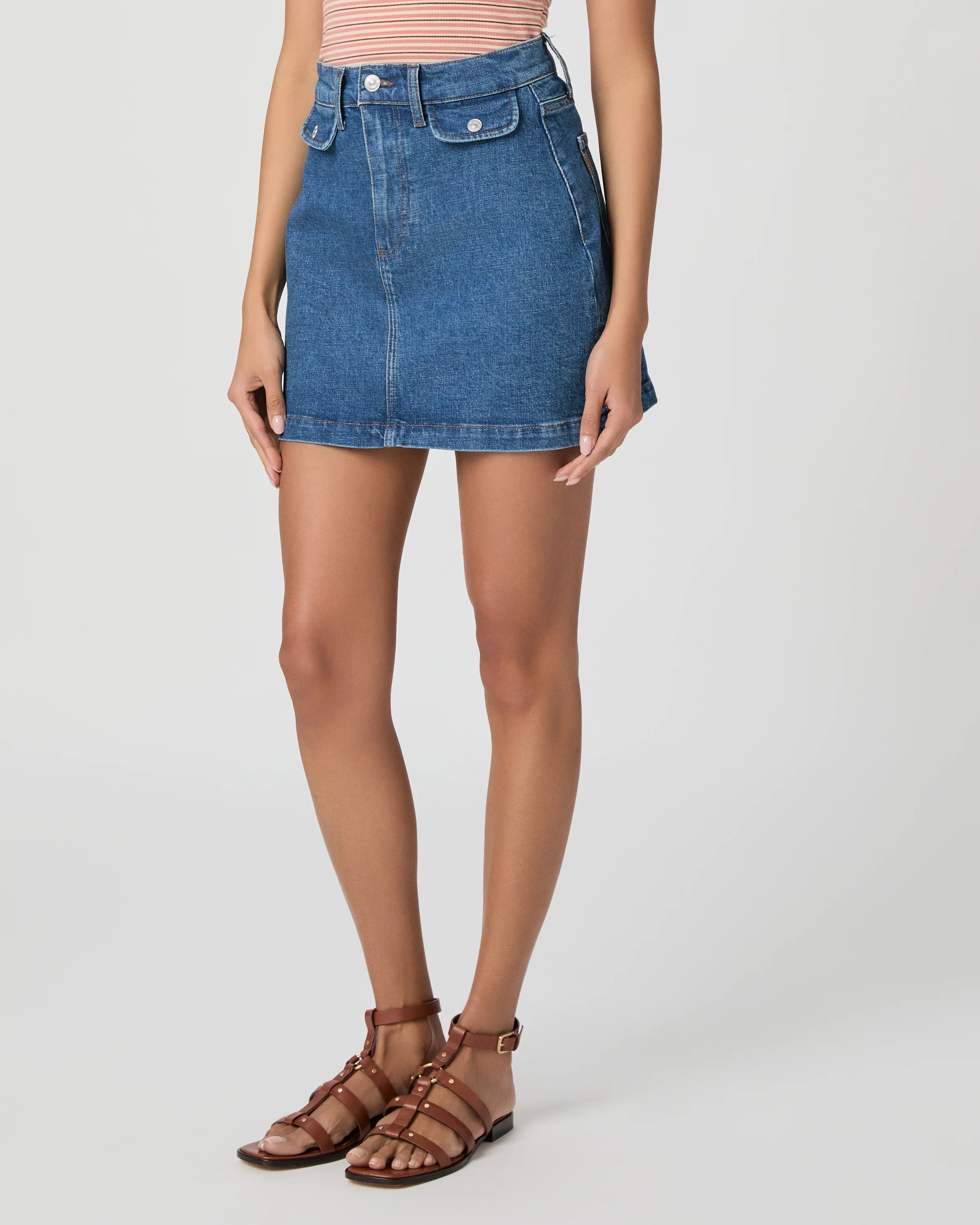 This high-rise denim mini skirt is designed with a slight a-line silhouette with rounded flap pockets in the perfect medium blue wash. Pair the Janelle Skirt with the matching Elly Jacket for a chic denim on denim look.